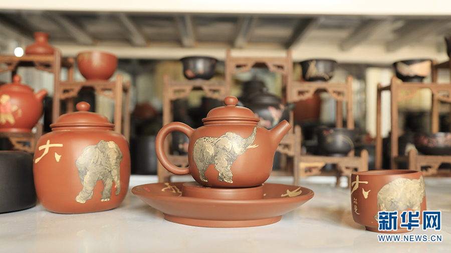 建水紫陶茶具上画着大象图案(摄于4月21日)。新华网 范芳钰 摄