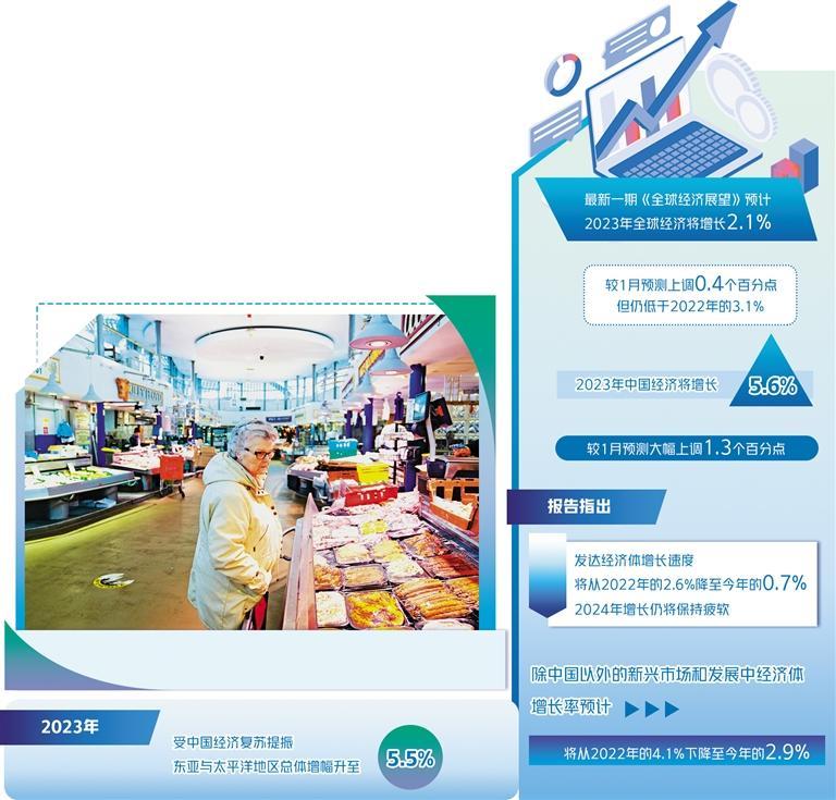 世界银行日前发布最新一期《全球经济展望》,预计2023年全球经济将增长2.1%,较1月预测上调0.4个百分点,但仍低于2022年的3.1%;2023年中国经济将增长5.6%,较1月预测大幅上调1.3个百分点。但是,世行认为,除个别经济体表现亮眼外,今明两年全球经济整体增长乏力,仍处于不稳定状态。