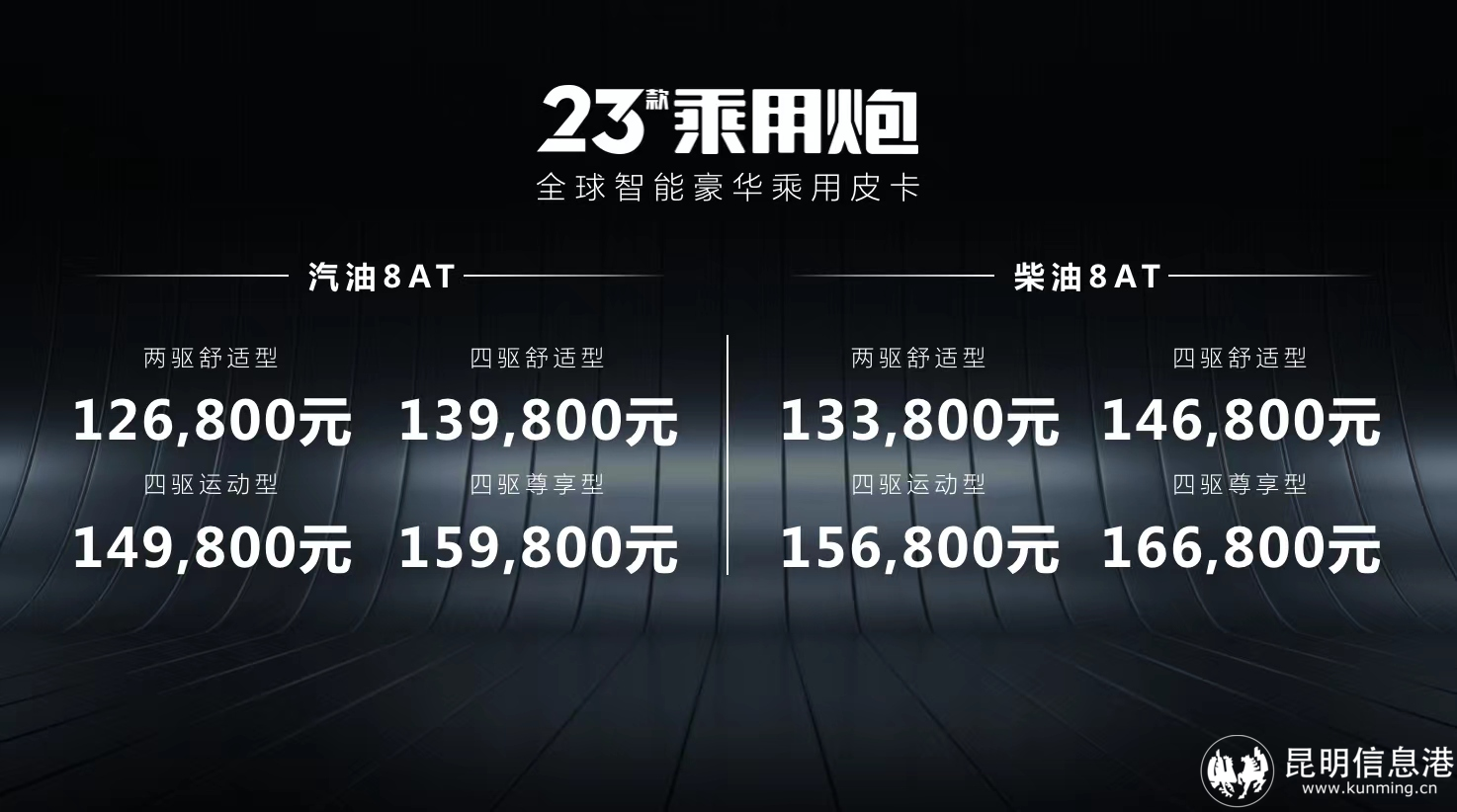 2023款乘用炮汽油车型官方指导价为12.68万元-15.98万元,柴油车型官方指导价为13.38万元-16.68万元。同时,购车用户还将享受金融礼、置换礼、互联礼、服务礼、推荐礼五重大礼。增配不加价 诚意满满!