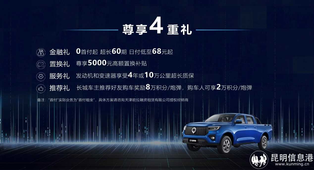 超强承载,高效便利。长城是第一个将乘用车标准应用到皮卡上的企业,无论设计、制造、生产均按照乘用车标准打造,车身采用镀锌板材,盐雾试验超过1000小时,底盘采用高强度梯形车架和钢板弹簧,承载力同级领先,装得多,才能赚得多!标配金属防滚架,有效保护车辆安全,新增外绳钩,物品固定更加方便;配备金属底盘护板,轻松应对创富路上的各种坎坷路。富路上带牵引资质,拓展多样生活。