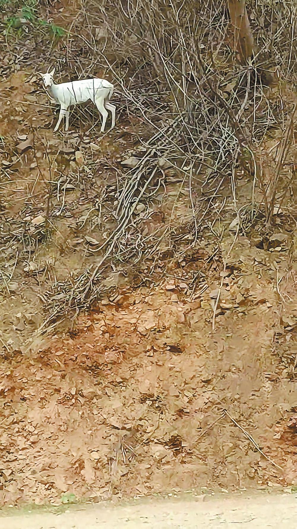近日,龙陵县三江口国有林场护林员在巡护途中发现一只白麂,他立即用手机记录下罕见画面。