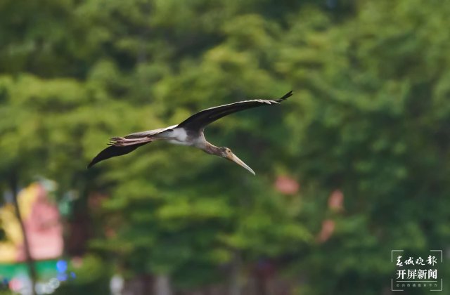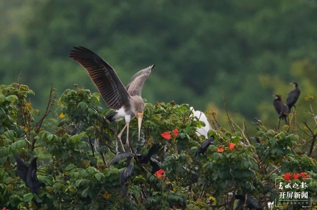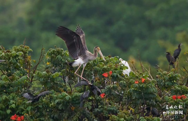 彩鹳为鹳形目鹳科的鸟类,橙色的头部赤裸无羽,繁殖期变为红色;橙黄色的嘴粗而长,但嘴尖稍微向下弯曲;体羽主要为黑色和白色,其中飞羽、尾羽为黑色,具有绿色的金属光泽,胸部具有宽阔的黑色胸带,也具有绿色的金属光泽,其余体羽均为白色。主要栖息于湖泊、河流、水塘等淡水水域岸边浅水处及其附近沼泽和草地上,非繁殖季节也常出现在农田和耕地,偶尔出现于沿海海边和盐碱地上。(春城晚报-开屏新闻 记者马楠 通讯员朱边勇 徐向东 摄影报道)