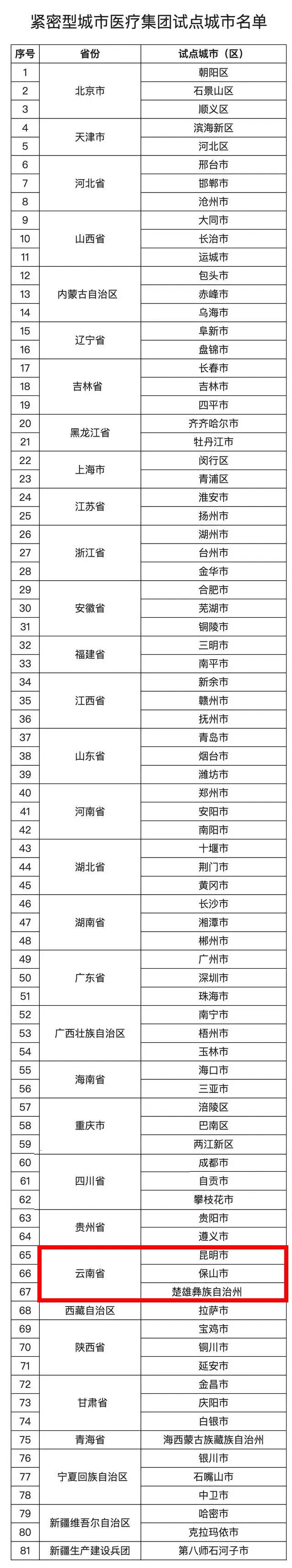 紧密型城市医疗集团试点城市名单