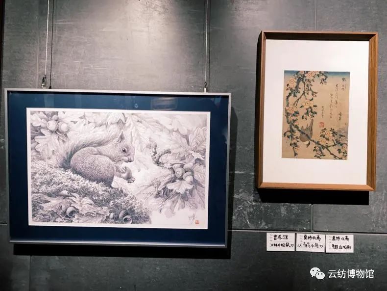 难得的是我们把葛饰北斋与曾孝濂的花鸟工笔风格的作品摆一起,这类东方技法与审美切入到科学博物体系的创作上(或许葛饰北斋在19世纪初期并没有这样明确的想法),而东方工笔画观察自然的方式在两位大家的创作上都留下痕迹,这种跨时空的接近我们荣幸地在云纺博物馆将之展示给大家。
