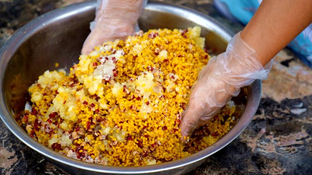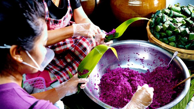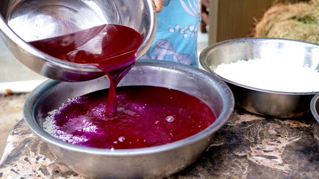 李雪家的彩色粽子主要以紫色和黄色为主,虽然制作工序繁琐,但对于勤快的李雪来说,显得非常轻松。将紫蓝草和粗糠花清洗干净,分别经沸水煮20多分钟,汤汁便成了浓浓的紫色和黄色,待凉透倒入糯米中,盖上竹筛浸泡一夜,白色的糯米染透到米芯,蒸熟后就可放入各种口味的馅料包成粽子了。李雪介绍,选用细粽叶包粽子很费时,但包出的粽子更入味更清香,且大小合适,老少皆宜。