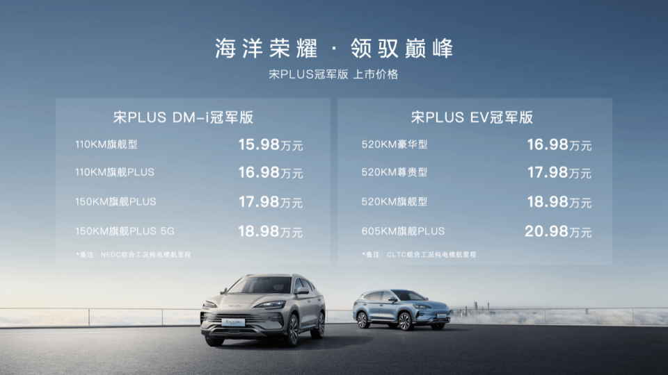 6月19日,比亚迪海洋网重磅冠军车型——宋PLUS冠军版正式上市,其中宋PLUS DM-i冠军版共4款车型,售价15.98万元-18.98万元,宋PLUS EV冠军版共4款车型,售价16.98万元-20.98万元。同时为用户准备了2年0息、置换补贴、充电桩、首任车主非营运车辆三电终身保修等多项购车好礼,让冠军产品惠及更多用户。
