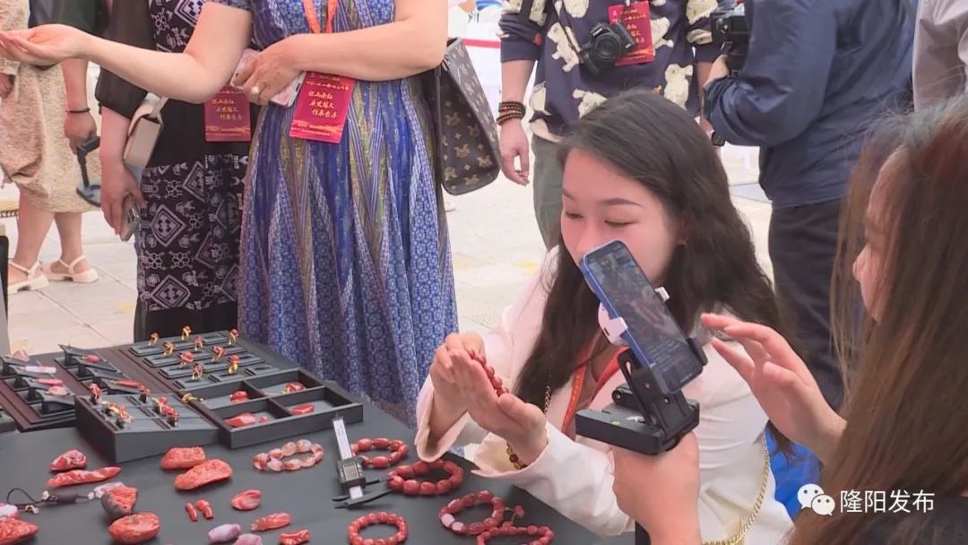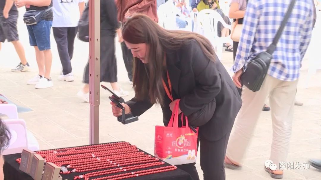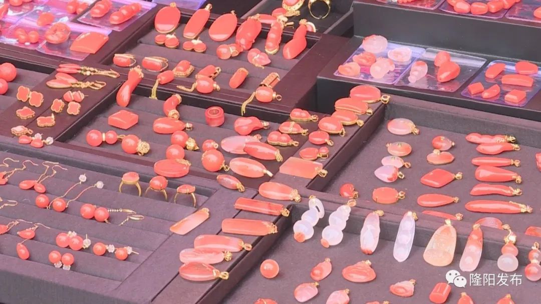 开幕式现场,邀请了40多家省内外南红商户前来设点参展,展示自家的南红产品。为了展示南红之美,各商家铆足了劲儿,拿出了压箱底的物件。展位上,各种精美的手串、手链、挂件、佛珠、原石摆得琳琅满目,让人目不暇接,许多客商专程从外地赶来挑选购买。