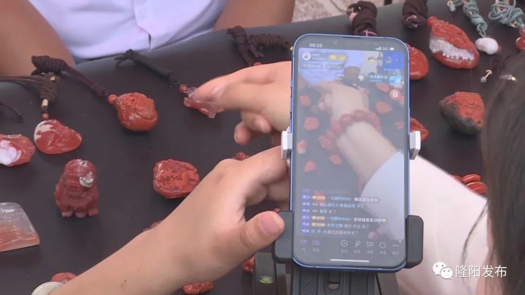 在活动现场,最引人注目的是正在进行直播的主播们,他们有的拿着手机,有的拿着相机,穿梭在各个展位前,向粉丝们介绍保山南红,帮他们挑选南红物件。
