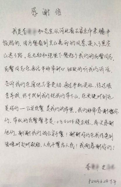 经过1个多小时的搜寻,民警最终在黑空山腹地找到了被困的李女士夫妇。随后,民警安全将李女士夫妇带下山,并将两人带回了派出所群众接待室作简单休整,帮助两人恢复体力。临别前,满怀感激的李女士写下一封感谢信,向民警致谢。