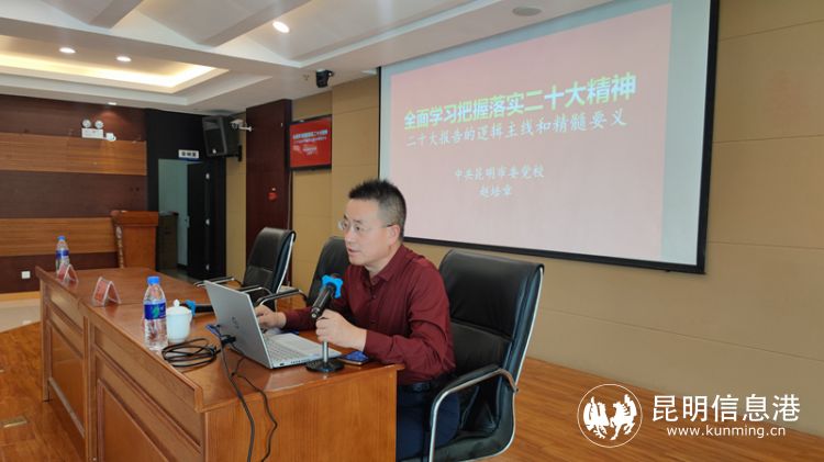 活动现场,大家面向党旗举起右拳,重温入党誓词,坚定理想信念。党员们纷纷表示,将一如既往不忘初心、牢记使命,自觉践行全心全意为人民服务的宗旨,以饱满的热情和昂扬的斗志投入到生活和工作中去,努力解决居民“急难愁盼”的问题。宣誓结束后,现场还邀请到昆明市委党校基本理论教研部主任、副教授赵培章为大家进行七一专题党课的授课,赵培章以《全面学习把握落实二十大精神——二十大报告的逻辑主线和精髓要义》为题,从战略定位、大会主题、实践基础等7个方面对二十大精神进行了详细讲解。