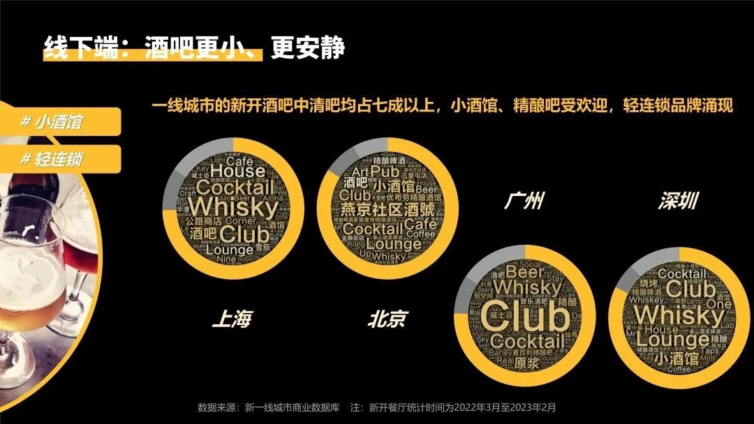 过去一年新开的酒吧呈现出两个特征:一是大量的小酒馆、精酿吧涌现,北上广深四座一线城市的新开业酒吧里,清吧占比均超过七成——新开的酒吧变得更小、也更安静了;另一个是轻连锁酒吧品牌在各地出现,并通过网红效应收获了一批忠实粉丝,比如上海的公路商店、北京的燕京社区酒號等。