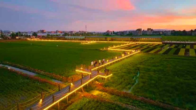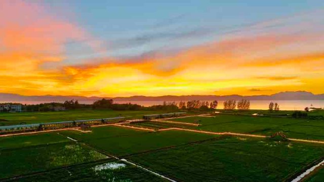 稻田边的人行步道边设置了灯带,华灯初上的时刻,傍晚夕阳将整片景区染上粉紫色滤镜,分外美丽,融合彩色的麦浪,仿佛还原昔年滇池周边的乡村景象。