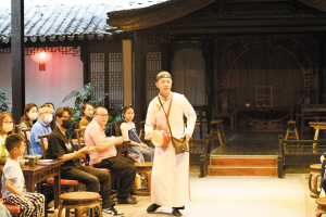 在莲花池庭院剧场演出开始前,演员与观众进行互动。