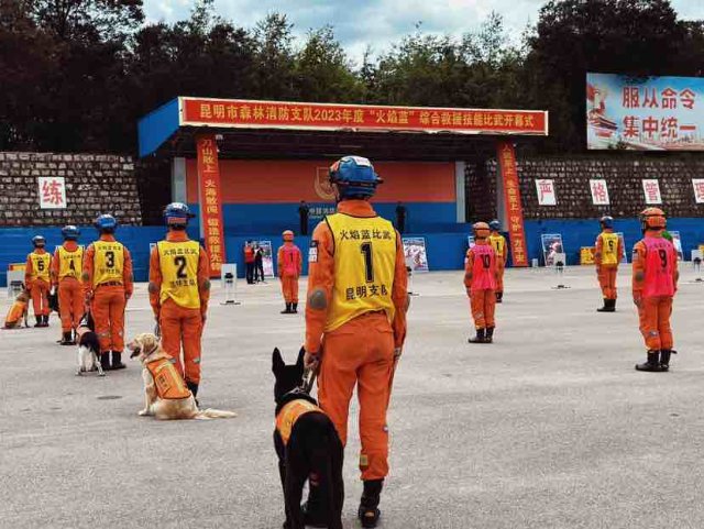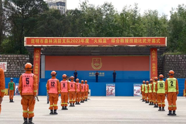 7月3日,昆明市森林消防支队2023年“火焰蓝”综合救援技能比武开幕式在安宁举行。来自该支队的9支代表队107名参赛队员和5只搜救犬将在5天的时间内,围绕灭火专业技能、特种救援技能两项比武同台竞技、激烈角逐。