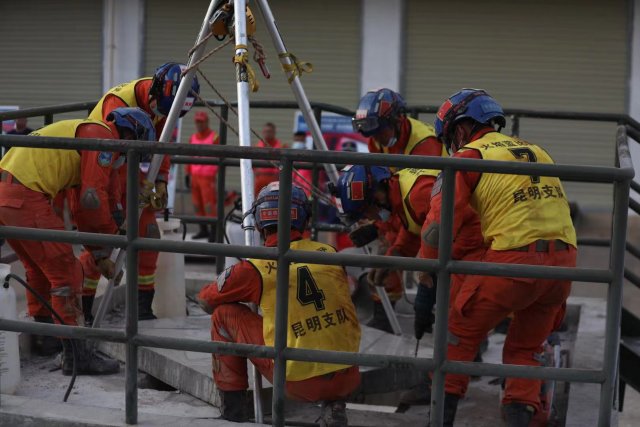 当天地震综合救援科目比武在云南省森林消防总队特勤大队训练场同步展开。参赛人员通过“Z”蛇形通道、途中移除障碍物、穿过狭小空间到达废墟位置,搜索营救伤员,并对伤员腿部骨折进行固定,迅速转运至安全区域,而后继续前进至废墟搜救场完成向下快速破拆,将井内被困人员安全救出,沿规定路线将1名伤员和1名受困者迅速转运至终点。