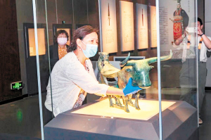 图为云南省博物馆工作人员正在摆放牛虎铜案准备展出。云南省博物馆供图