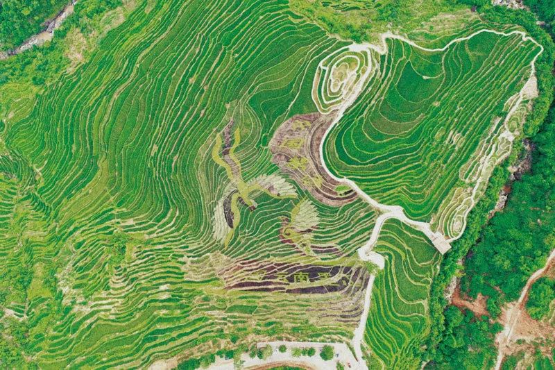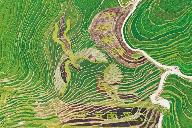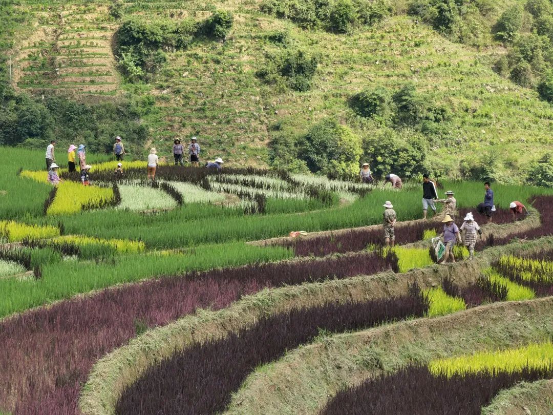 绿色、粉红色、紫色等5种彩色水稻禾苗共同“绘”出两只栩栩如生的白鹇鸟和“中国紫谷”“中国云南墨江”的字样。
