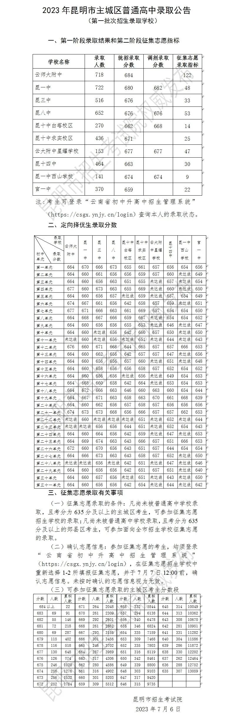 刚刚,2023年昆明中考提前批次、第一批次第一阶段估分填报志愿录取结果公布。第一批次招生学校考生第1轮填报征集志愿时间为7月6日15:00~7日11:00。