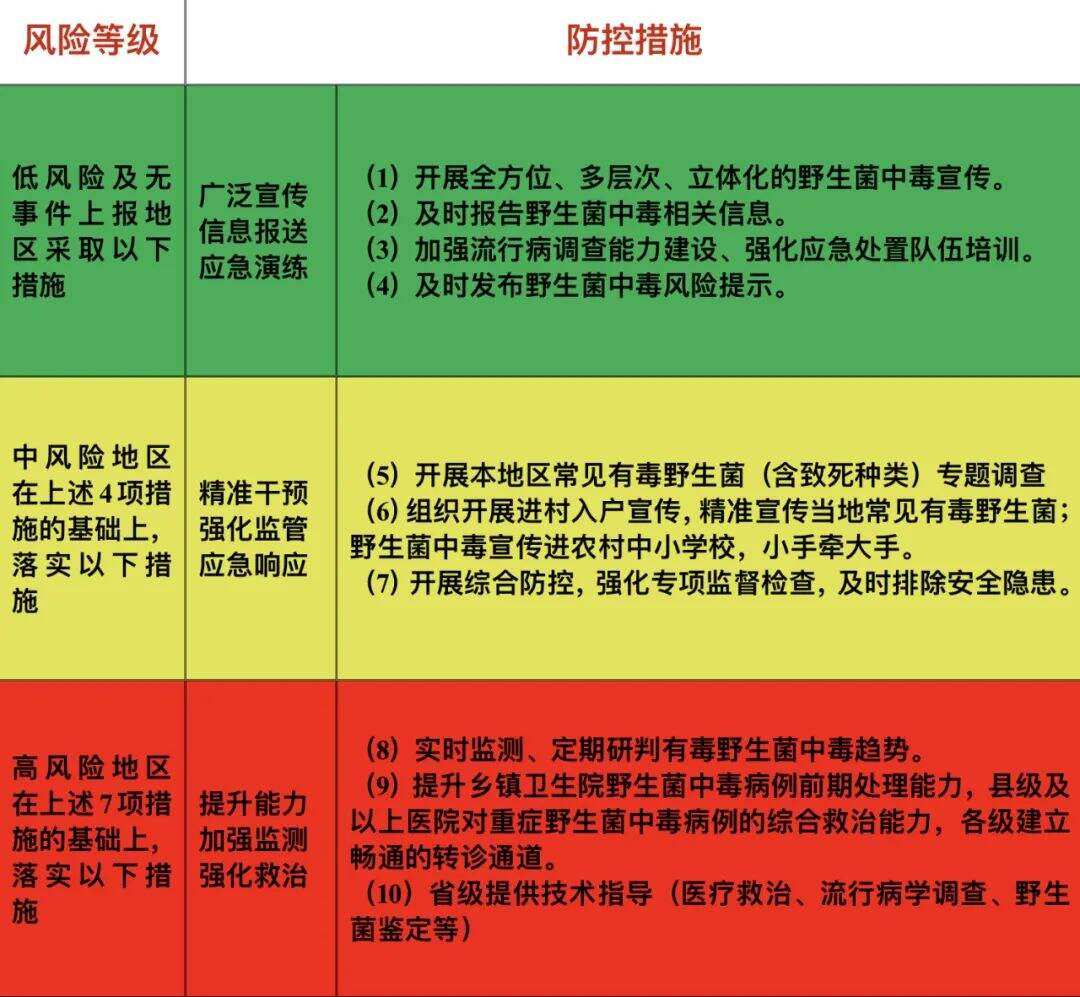全省共划定有毒野生菌中毒风险高风险地区7个(宜良县、红塔区、华宁县、新平县、澜沧县、墨江县、砚山县),中风险地区51个,低风险地区62个,无上报地区9个。对不同风险等级地区,从宣传发动、信息报送、加强监测、精准干预、强化监管、应急响应、强化救治等方面,分级分层、针对性制定2023年全省有毒野生菌中毒风险防控措施。