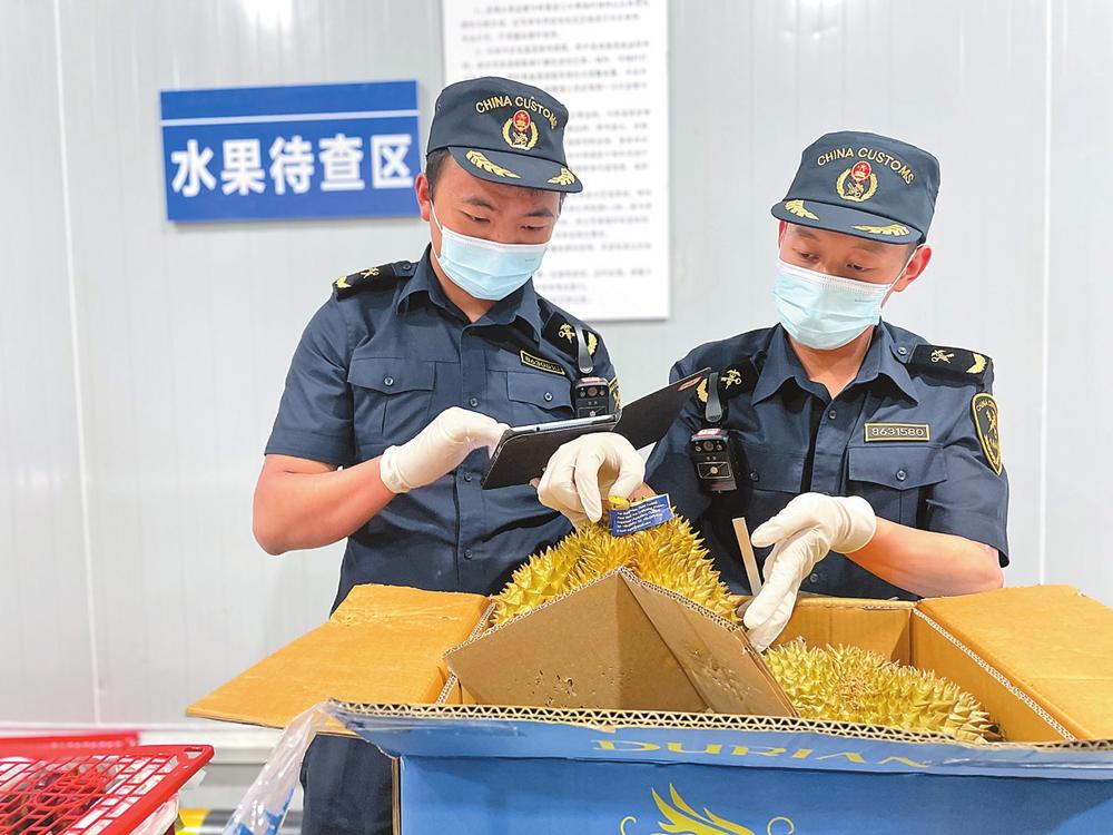 海关关员对通过中老铁路入境的榴莲进行查验。 供图
