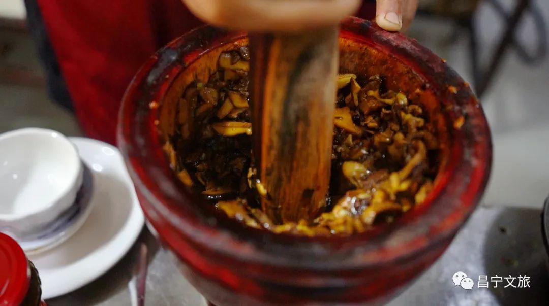 “舂”在昌宁最先是傣家菜的一种吃法,将准备好的食物放到木质的容器内,佐以辣椒、花椒、盐巴、酱油等调料,再用一根木棒舂击使味道充分的释放。