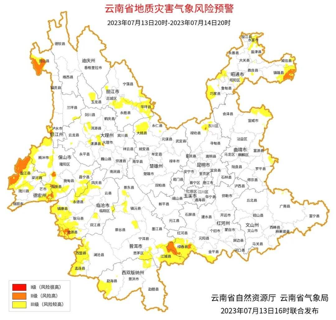 预计2023年7月13日20:00~7月14日20:00,昭通市镇雄县,昆明市禄劝县,怒江州贡山县、泸水市,保山市隆阳区、腾冲市、龙陵县,德宏州盈江县、芒市,临沧市沧源县,普洱市江城县、墨江县,红河州绿春县发生滑坡泥石流的风险高;昭通市北部至中部、东部,昆明市北部,楚雄州西北部,大理州中部,丽江市中部至东部,迪庆州东部,怒江州北部、东部、西南部,保山市大部,德宏州大部,临沧市北部至西南部、东部,普洱市北部至东南部、西南部,西双版纳州西南部、东北部,红河州西南部至南部发生滑坡泥石流的风险较高。(云南气象)