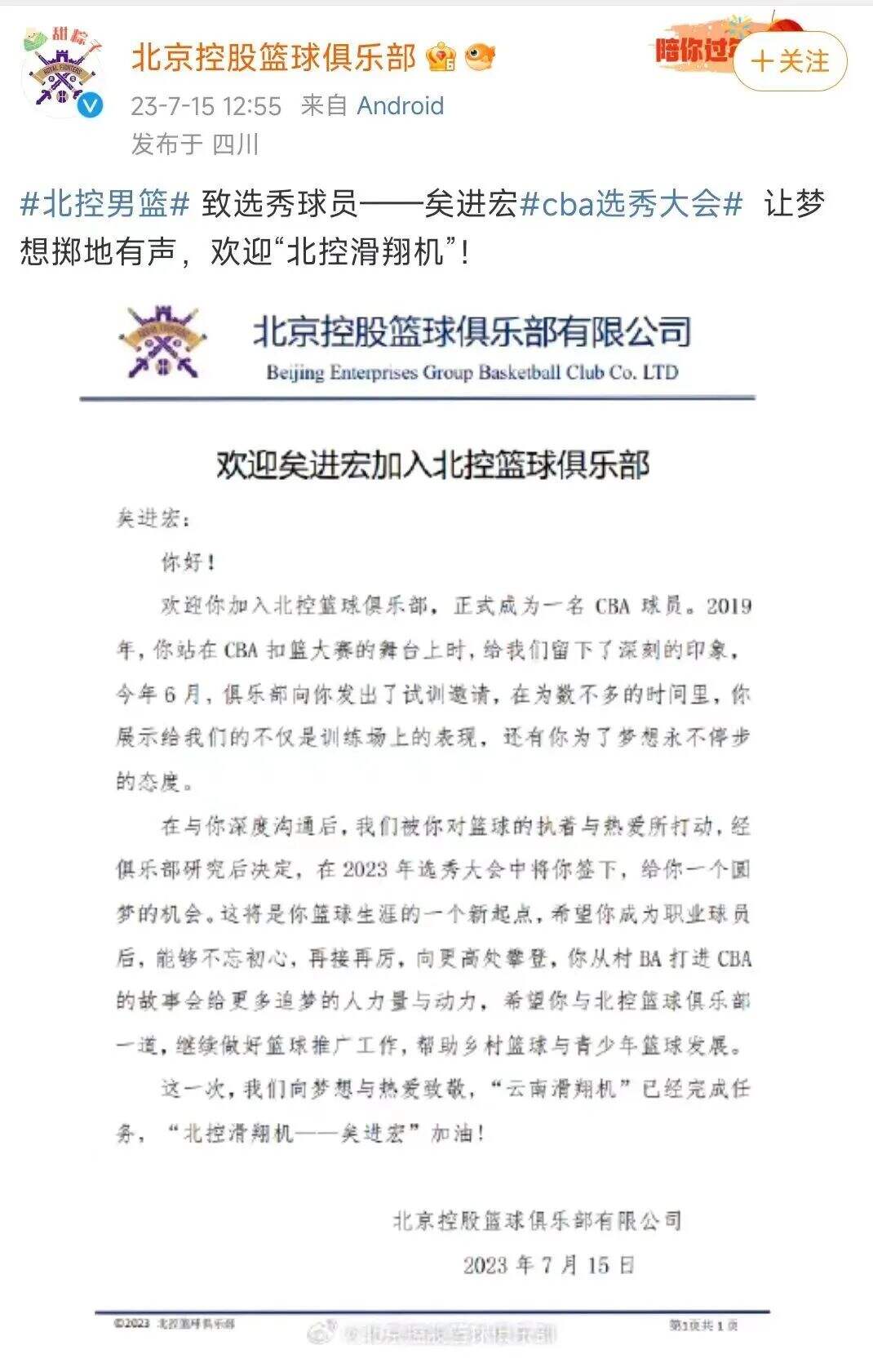 当天中午,北京控股篮球俱乐部在微博发文欢迎矣进宏的加入。