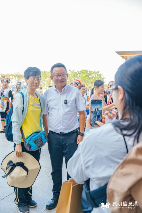 在弥勒高铁站出站口,潘金军热情地与出站游客握手交流,赠送小礼品,并为游客们介绍弥勒的各个景点,以及暑假期间推出的一系列特色文旅活动和优惠政策。