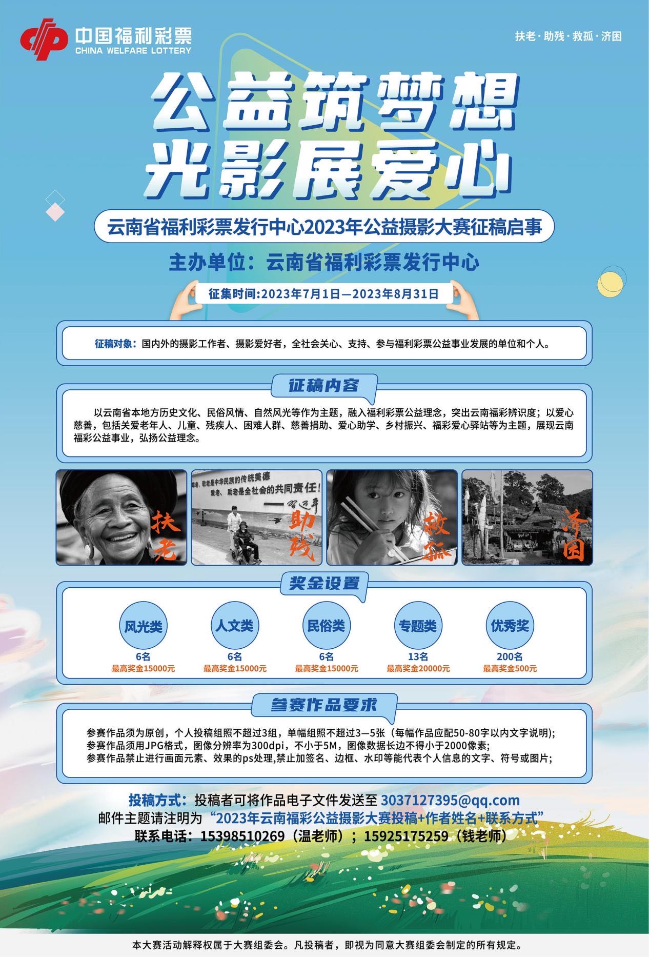以光影留住善举,用公益传递梦想。2023云南福彩公益摄影大赛还在持续征集作品中,如果你热爱云南、热衷公益、关注福彩,欢迎积极参与,留住美的瞬间。