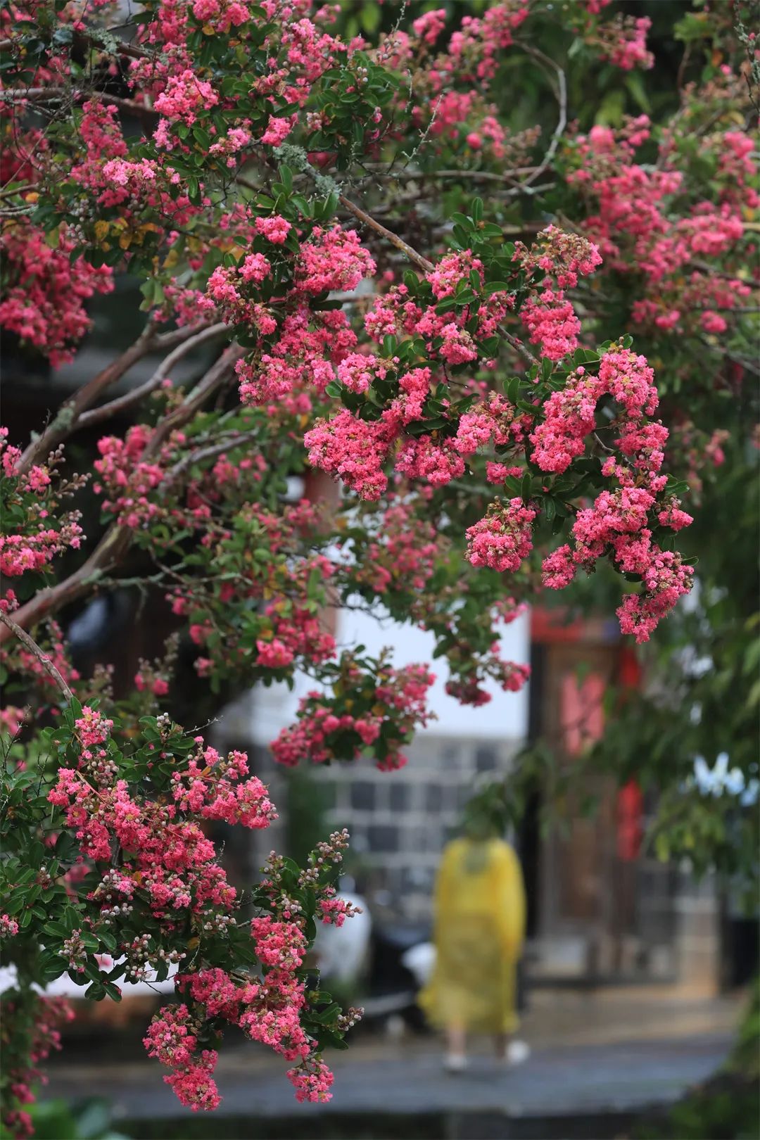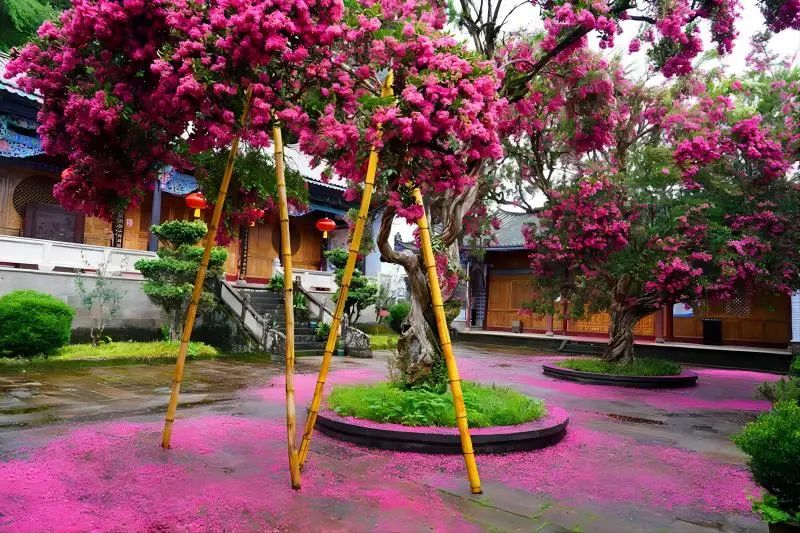 当古建筑木质的素朴,叠檐飞拱的雄壮,雕梁镂窗的精美,金彩粉饰的典雅,与映阶窥窗、飞霞流丹的紫薇花相衬相映,一幅诗意的画卷便徐徐展开了。碧瓦飞甍间,雕梁画栋下,紫薇花团团簇拥,串串坠玉,姹紫嫣红,云蒸霞蔚。