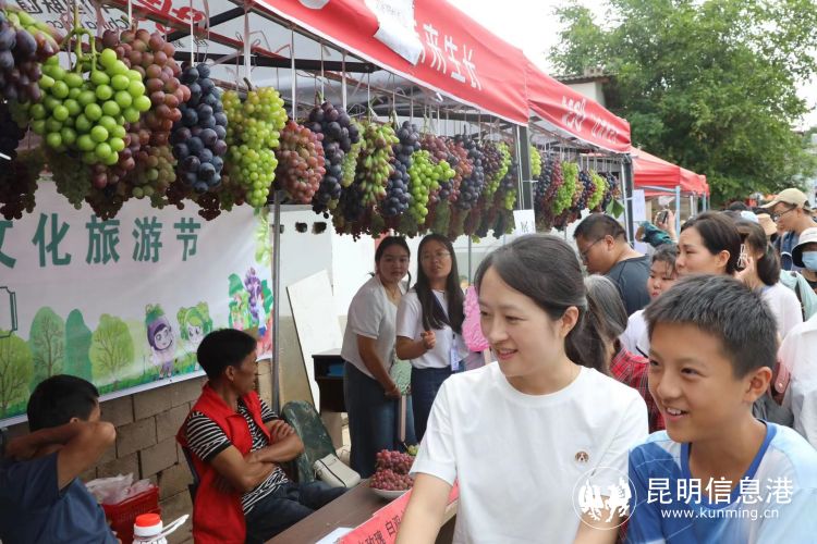 昆明信息港讯 记者杨雁 “葡萄串起大团结 ‘葡’写振兴手拉手”。7月22日,安宁市禄脿街道第八届葡萄文化旅游节在艾家营村委会启幕,来自四面八方的游客共赴禄脿,游美丽村庄、赏果园靓景、品葡萄美味、尝特色美食,与禄脿人民共赴一场“陶”醉一夏的葡萄盛宴。