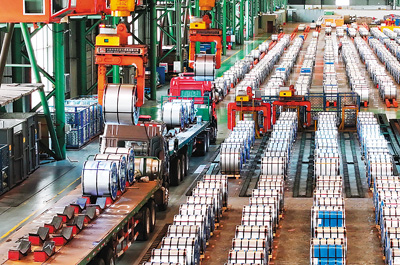 河北省唐山市持续优化钢铁产业布局,推动钢铁产业向精深化、高端化发展,不断延长钢铁产业链条,大力发展高附加值、高竞争力产品,全面提升高端精品钢材比重,助推经济高质量发展。图为首钢京唐钢铁联合有限责任公司镀锡板事业部成品库内,吊装设备在将镀锡板装车。新华社记者 朱旭东摄
