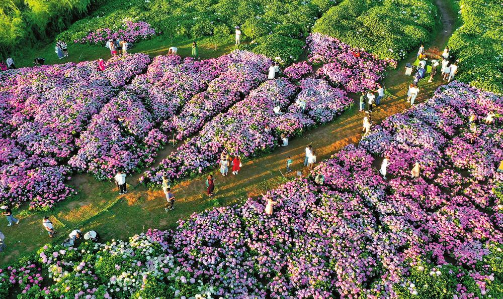 盛夏时节,昆明斗南湿地公园67亩的绣球花主题花卉园内,鲜花竞相开放,吸引众多游客前来赏花休闲。(云南日报记者 陈飞 摄)