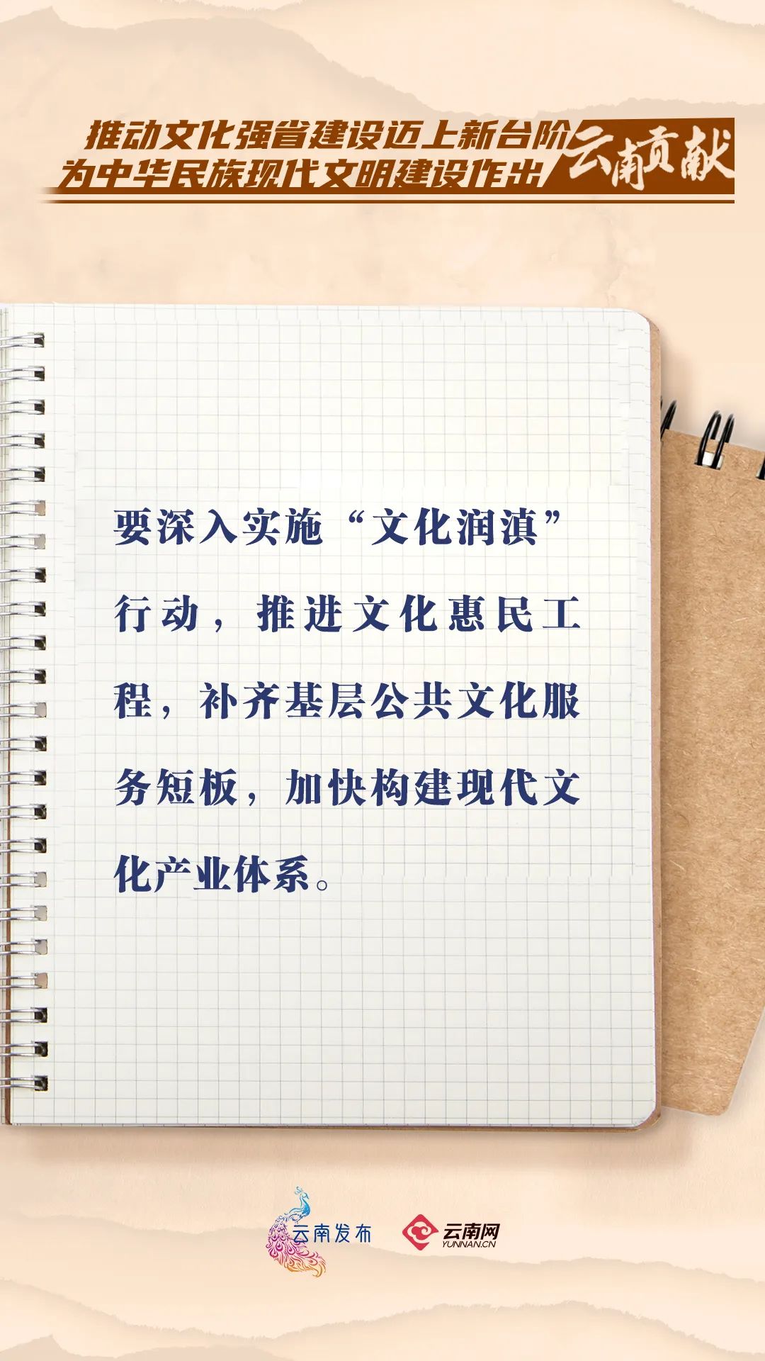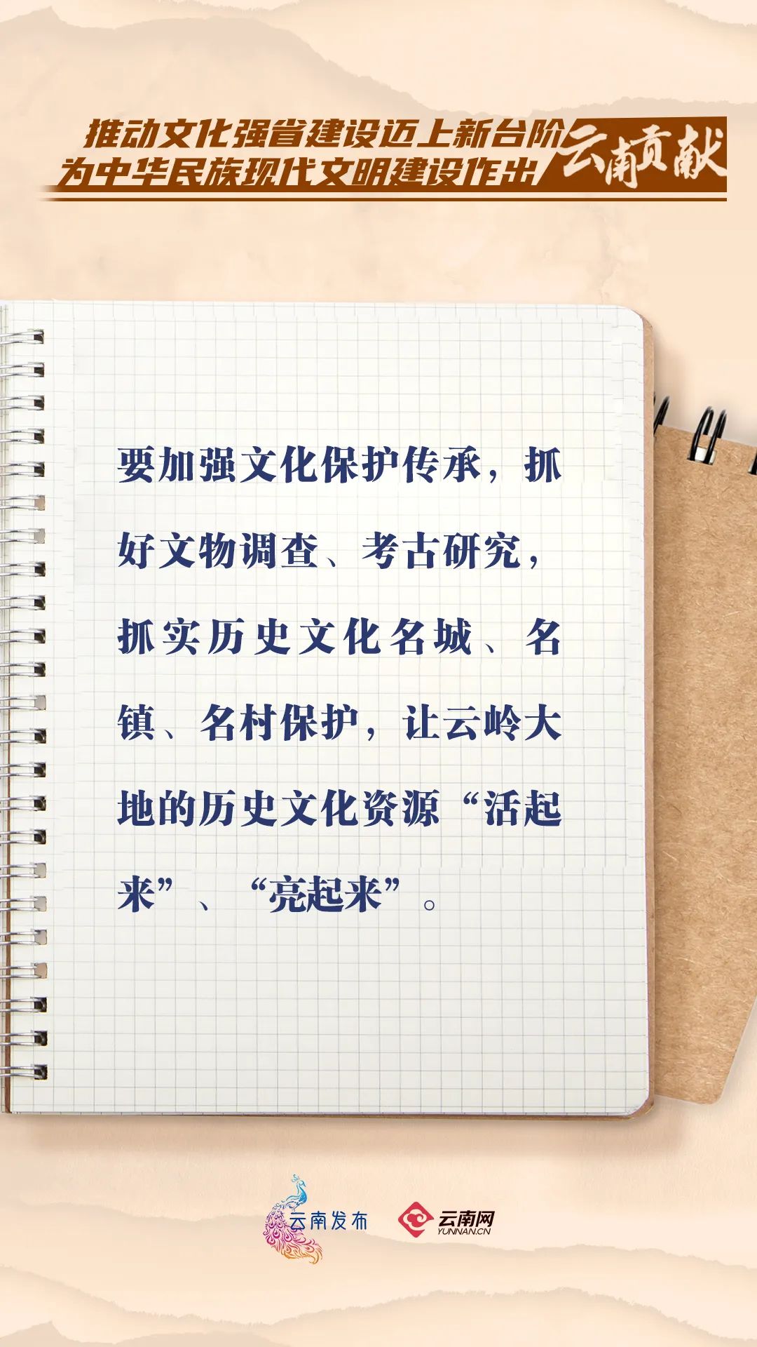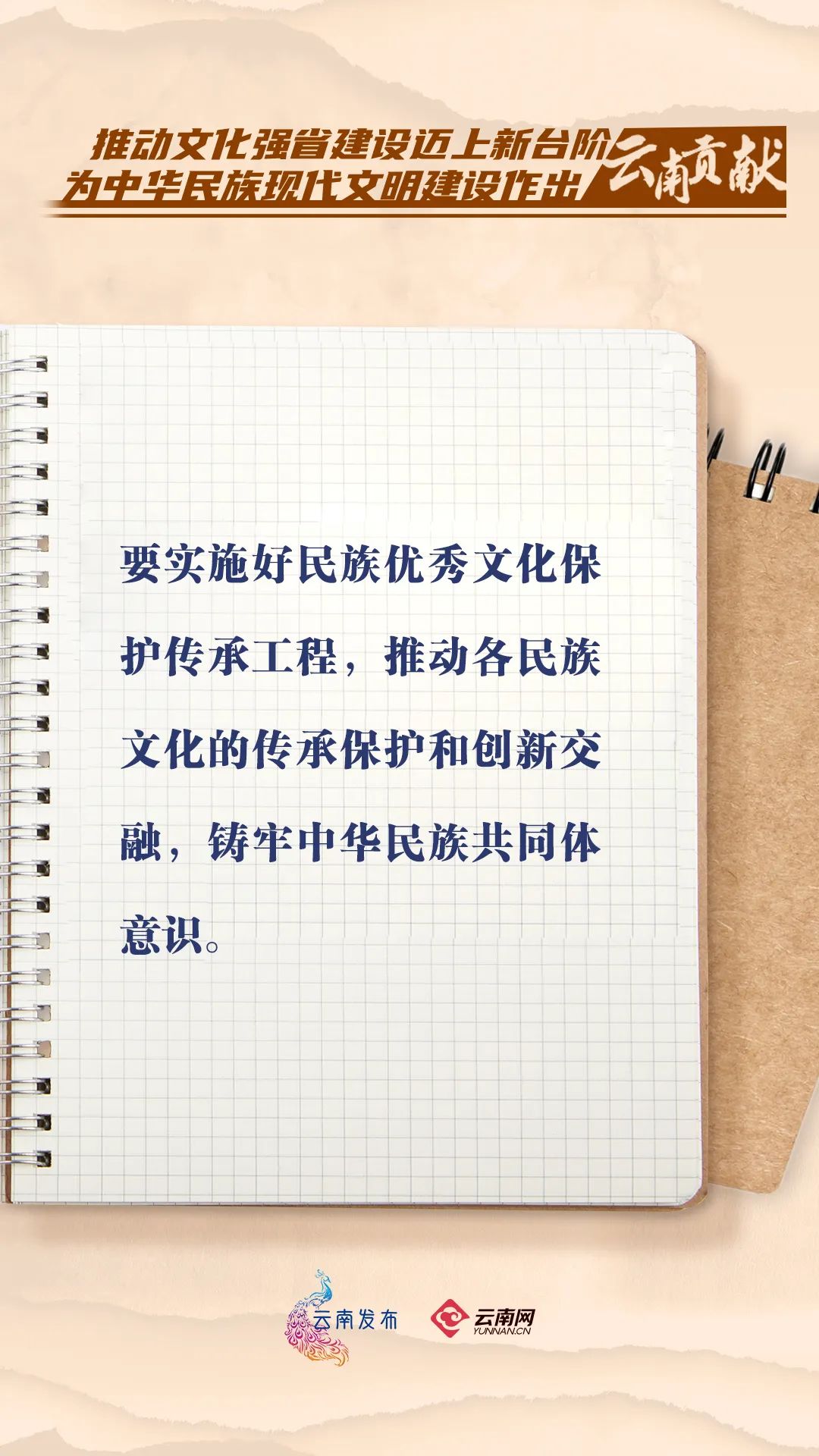 云南文化资源是中华文化的重要瑰宝,文化遗产丰富厚重,民族文化多姿多彩,革命文化资源富集,文旅资源独具魅力,民族文化的交流繁荣有力促进了民族团结进步。要站位服务建设中华民族现代文明大局,积极推进文化强省建设,为全省现代化建设提供坚强的思想基础、文化支撑、精神力量。