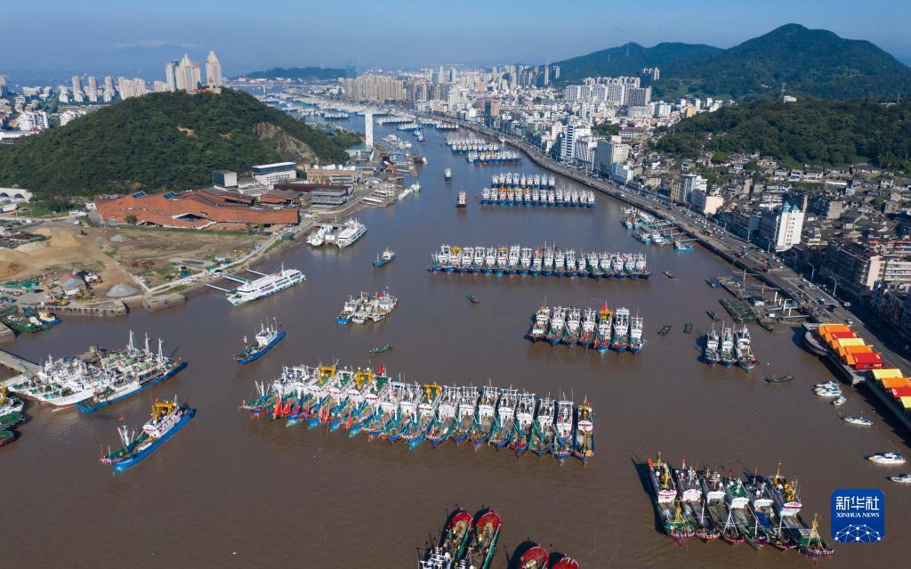 8月6日,停泊在舟山普陀沈家门渔港的渔船即将出港(无人机照片)。