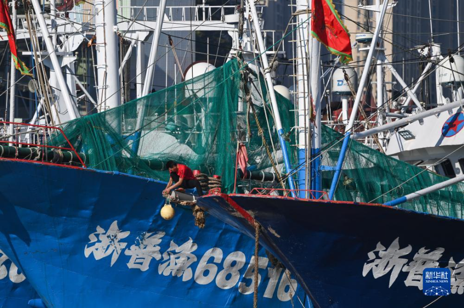 8月6日,停泊在舟山普陀沈家门渔港的渔船上的渔民们在为当天的开渔做准备工作。