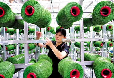 在山东省乐陵市泰山体育产业集团有限公司,工人在人造草坪智能化生产车间作业。新华社记者 范长国 摄
