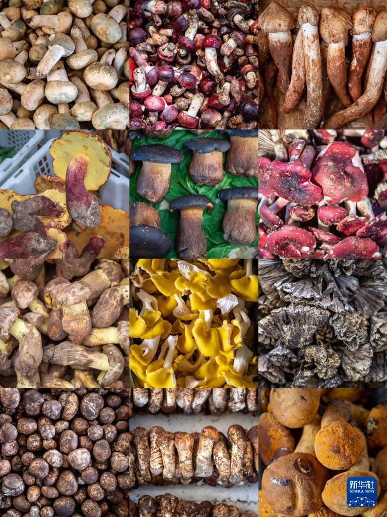 昆明野生菌交易市场上热销的野生菌(拼版照片)。新华社记者 江文耀/摄