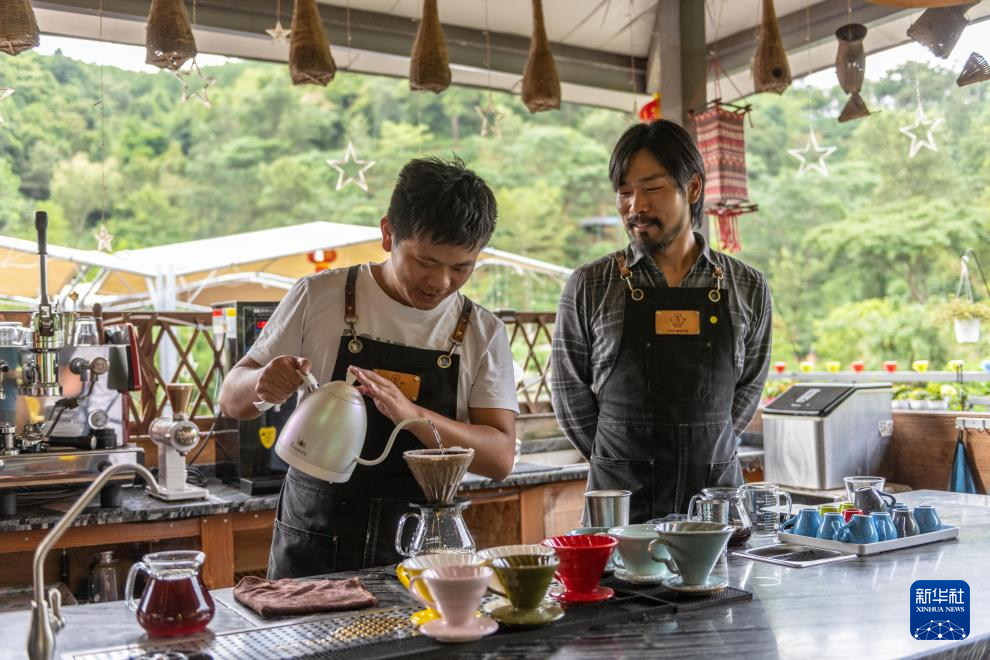 普洱市的咖啡师正在为游客制作咖啡。新华社记者 曹梦瑶/摄