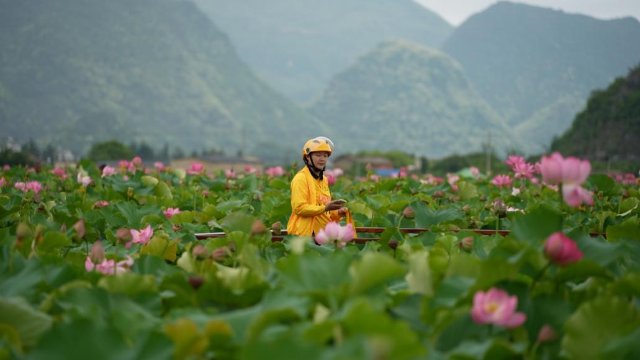 28岁的景区外卖骑手陈婷婷划着小船,穿过普者黑景区接天莲叶无穷碧的荷塘,将一份外卖送到顾客手中。普者黑是典型的喀斯特岩溶地貌,田园、湿地、峰林等景观交错。游客点单时,往往会将收货地址标注为某个桥、某个亭子或者某个马车停车场旁边。“在大城市,骑个电动车就能直接抵达终点。在景区里,骑手可能需要同时掌握陆路和水路交通工具的灵活应用。比如某个游客定位是在某个湖泊旁边,我就划船过去送,会更加方便。这种送外卖的体验也非常有趣。”