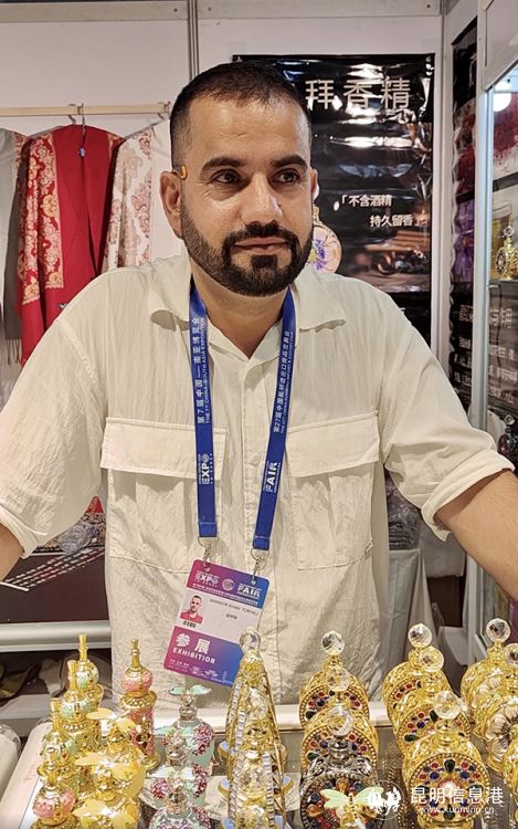 走近境外馆迪拜展区的一处角落,一股香气扑鼻而来,“这是纯植物香精,不含酒精香味持久。”参展商商阿吉(中文名)用带着阿拉伯语口音的中文详细地向顾客介绍他的产品:香精、藏红花和披肩。和阿吉聊天中得知,这是他第一次来南博会参展,虽然才来昆明5天,他已经喜欢上昆明的天气,感觉很凉爽。