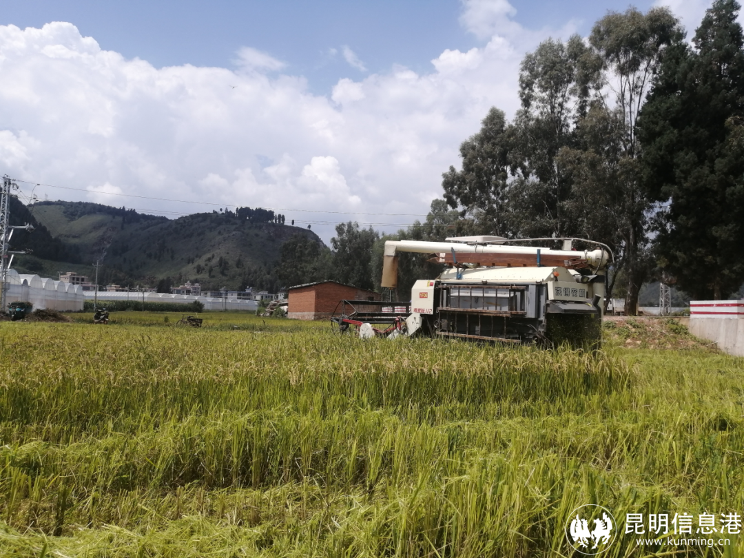 昆明信息港讯 秋高气爽,清风徐徐。收割机在金黄的稻田里奔腾,长长的穗子飞卷入收割机的“肚子”,把稻草“消化”还田后,沉甸甸的谷子通过传送管流进了口袋里,没有比一个丰收的秋天让人感觉更踏实的了。