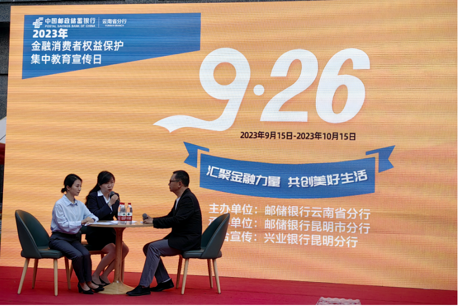 昆明信息港讯 “高额理财产品,很有可能是诈骗,不但没有利息,很有可能本金也被骗光。”9月26日,邮储银行云南省分行牵头,邮储银行昆明市分行联合兴业银行昆明分行开展了以“汇聚金融力量·共创美好生活”为主题的2023年金融消费者权益保护集中教育宣传日活动。