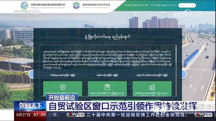 9月27日,CCTV-13央视新闻频道《朝闻天下》栏目在中国自贸试验区建设十周年系列报道——“自贸试验区窗口示范引领作用持续发挥”主题中,聚焦云南自贸试验区围绕窗口进行拓展深化的创新改革举措。报道指出,在云南自贸试验区,中文、英语、缅甸语、老挝语四种语言在这里的窗口无缝切换,多语种服务多国企业,构建面向南亚、东南亚的产业开放平台。
