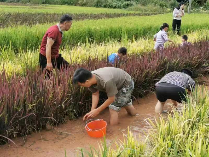 作为当天活动的重头戏,稻田摸鱼“野”味十足,受到游客热烈欢迎。大家置身田间嬉戏,化身“摸鱼能手”,徒手摸鱼,解锁开盲盒的惊喜。鱼儿在腿间自由穿梭,软软的泥土和金灿灿的稻田间,充满了爽朗的笑声。人们与鱼儿在稻田里“ju你追我赶”,摸到的稻花鱼还可以带回家。一场摸鱼狂欢,唤起了大人们儿时的记忆,也给孩子们感受到了亲近自然的童年乐趣。