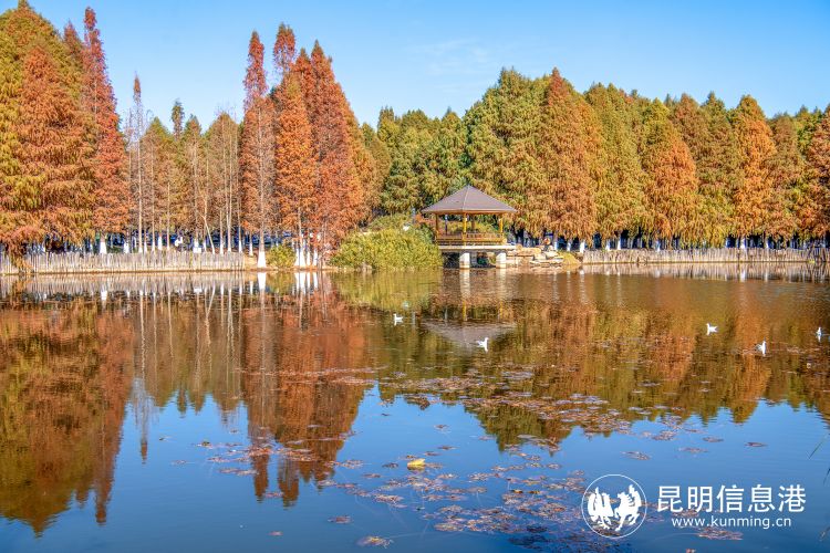 进入冬季,滇池湿地的水杉变红,美景如画。