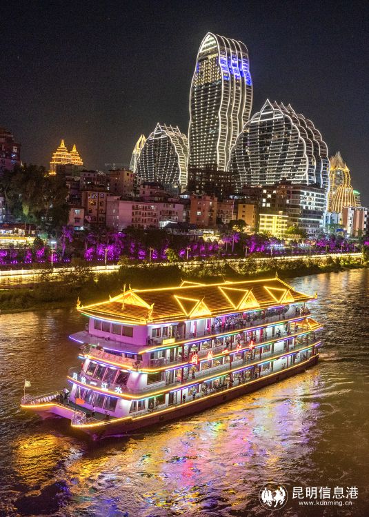 澜沧江夜景,在告庄及游船映衬下,美得如梦如幻。