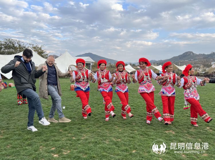 除此之外,参访团还前往位于滇池河畔的晋宁区小渔村,在有水、有船、有院、有田、有人家的村落旁,围着点燃的篝火,观赏由当地村民表演的彝族秧佬鼓舞。随着演出进入高潮,嘉宾们不禁被村民们的热情所感染,纷纷加入到打跳的队伍中,沉浸式体验云南少数民族歌舞的活力与激情。