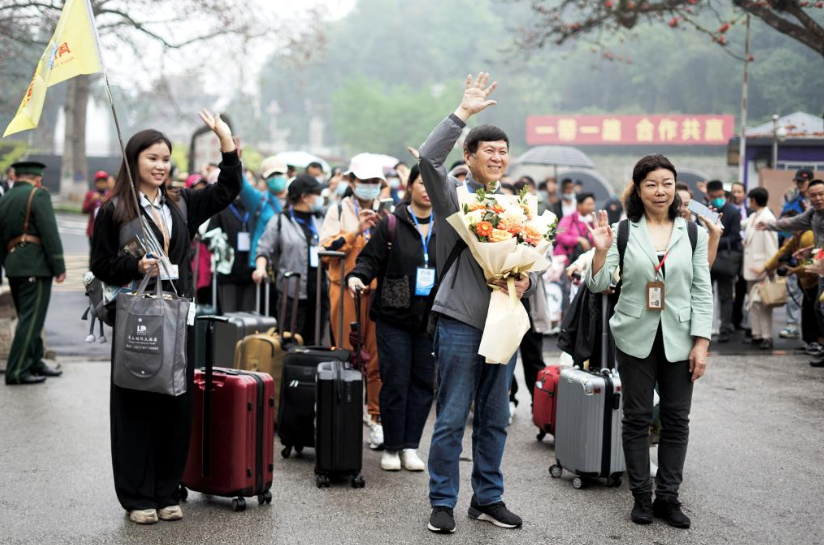 3月15日,在越南谅山省的友谊国际口岸,越南文化体育与旅游部旅游总局副局长何文超(前右二)向中国游客发放纪念品。(新华社记者胡佳丽摄)