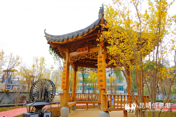 位于梁王路与兴园路交叉口光明璟宸小区旁的听泉映月汲取传统中国园林精髓,运用木质结构打造传统亭廊,银杏、桂花、滇朴、红枫、樱花、竹子等树木与拱桥、凉亭、圆桌、座椅、小型儿童游乐设施等休憩设施打造出别样的景致,水景浮光和水色交错出古朴的画卷。